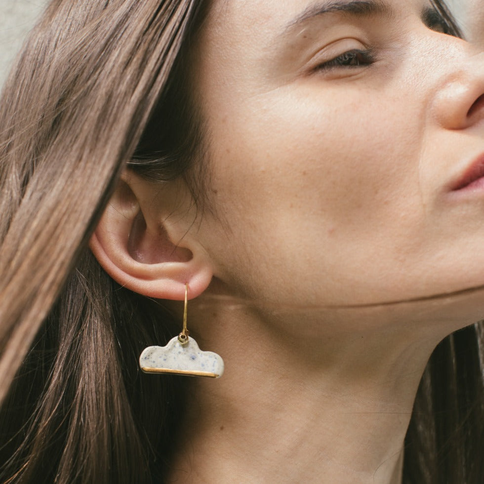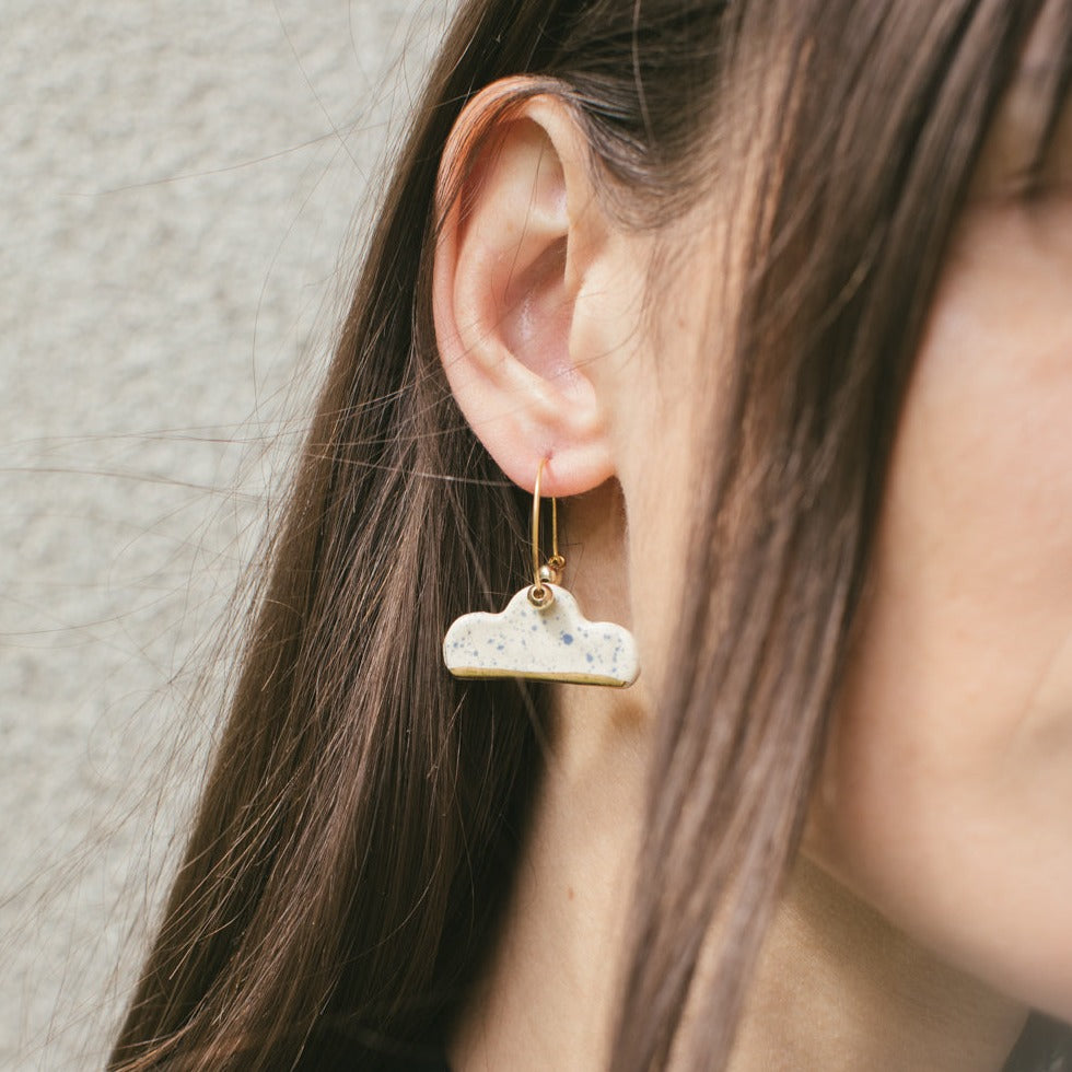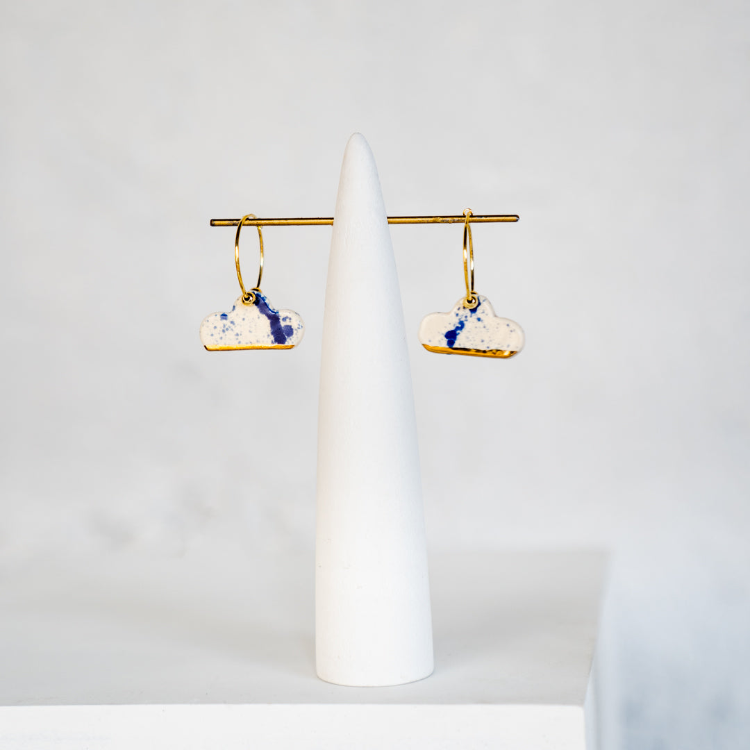 Aros modelados a mano en loza esmaltada y oro amarillo. Argolla en baño de oro, muy livianos.