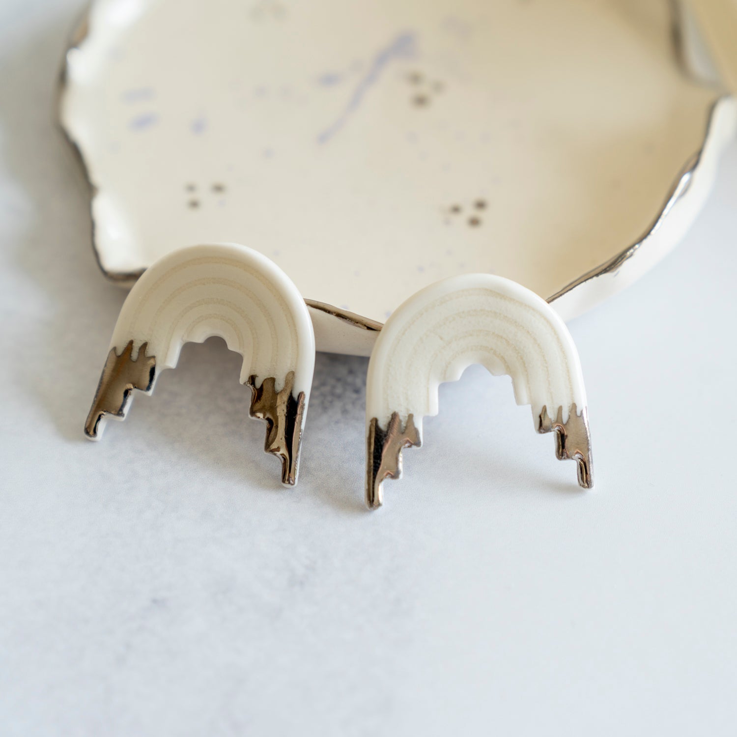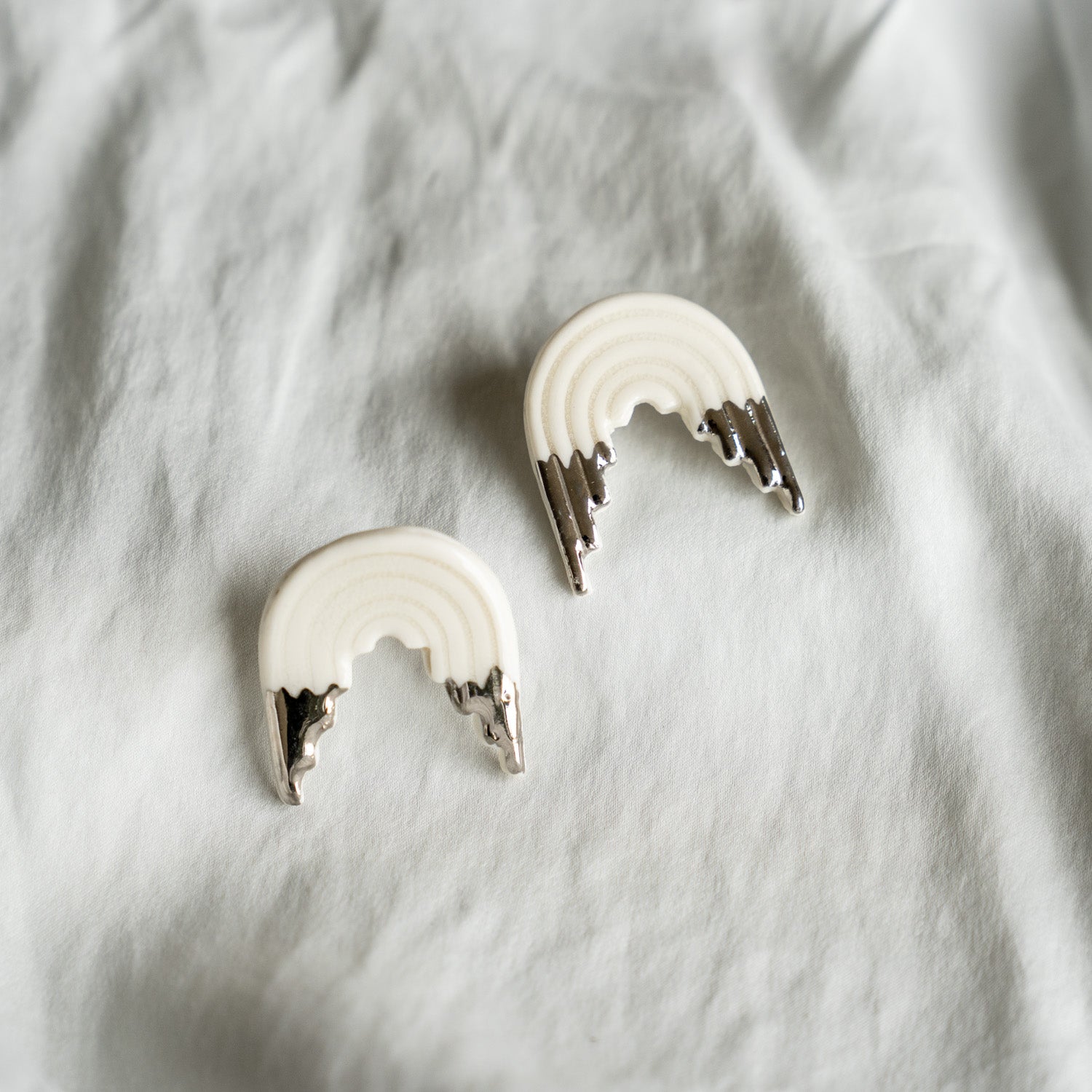 Aros modelados a mano en porcelana esmaltada y oro blanco. Ganchito en plata 925 libre de níquel, muy livianos.