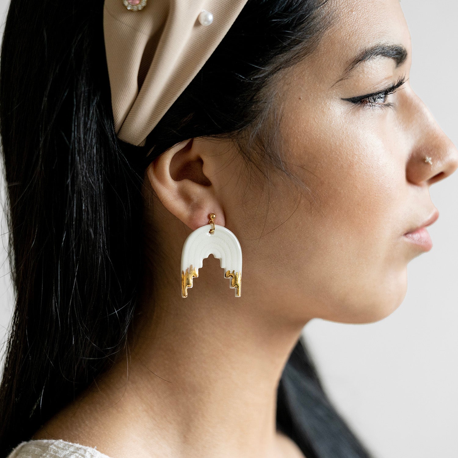 Aros modelados a mano en porcelana esmaltada y oro amarillo. Ganchito en baño de oro, muy livianos.