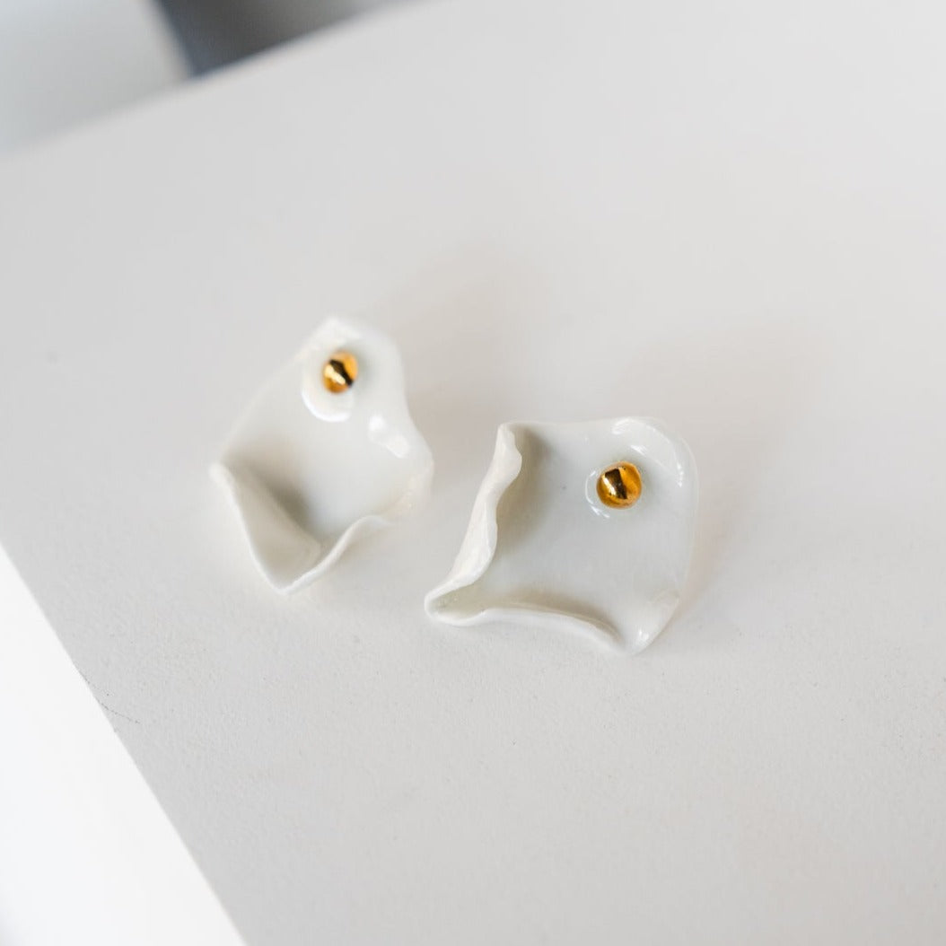 Aros asimétricos, pieza única. Porcelana en color natural, modelada y esmaltada a mano, toques de oro 22k, ganchito de plata 925.