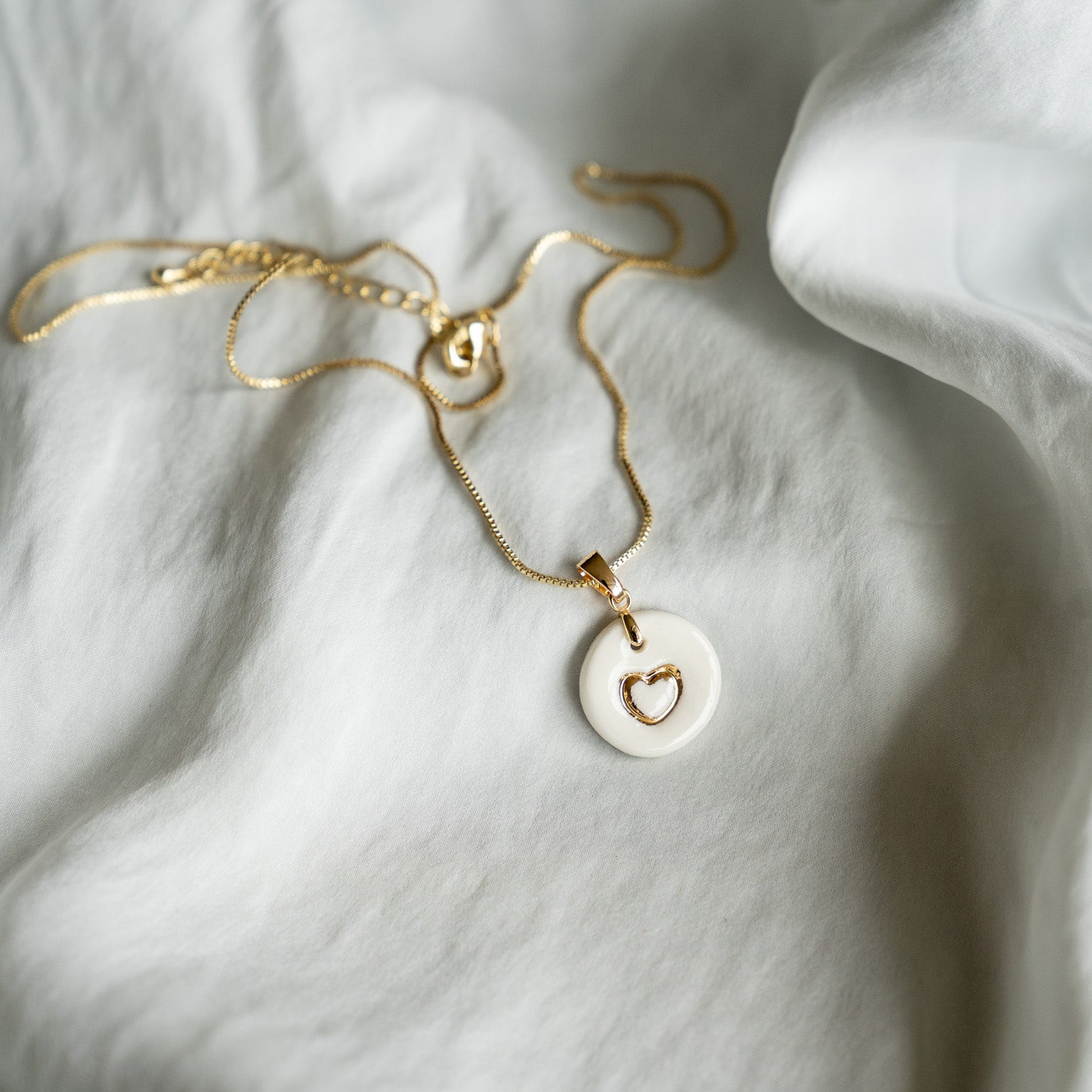 Medalla de porcelana modelada y esmaltada a mano, hermosa y delicada con detalle en oro de 22k. Cadena veneciana bañada en oro de 45cm con extensor (llega a 50cm).