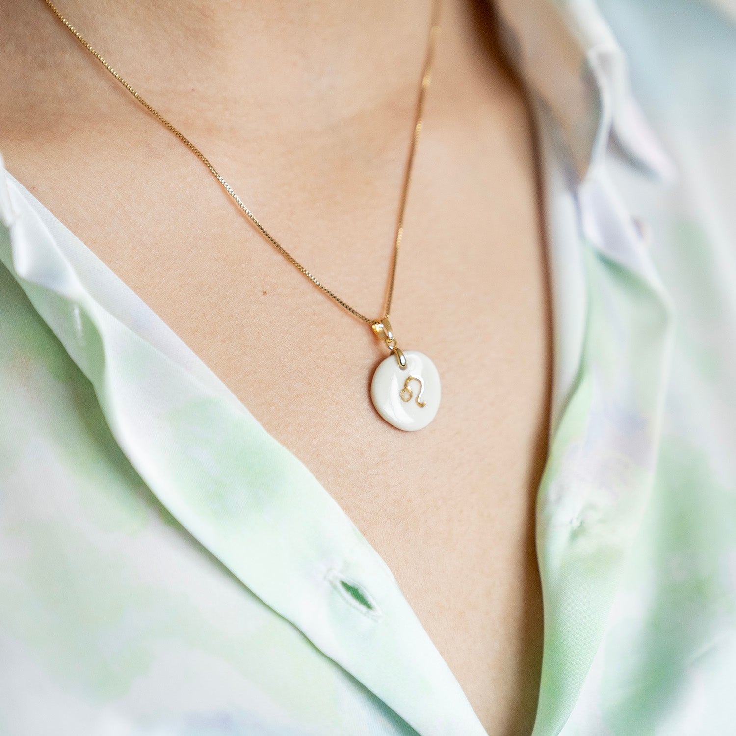 Pieza de porcelana modelada y esmaltada a mano, hermosa y delicada con el signo en oro de 22k. Cadena veneciana bañada en oro de 45cm con extensor (llega a 50cm).