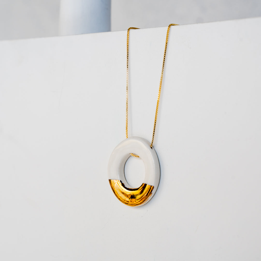 Pieza de porcelana esmaltada con aplicación de oro 18 k. Cadena baño de oro ajustable.