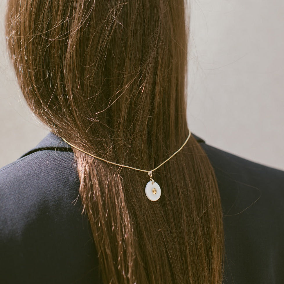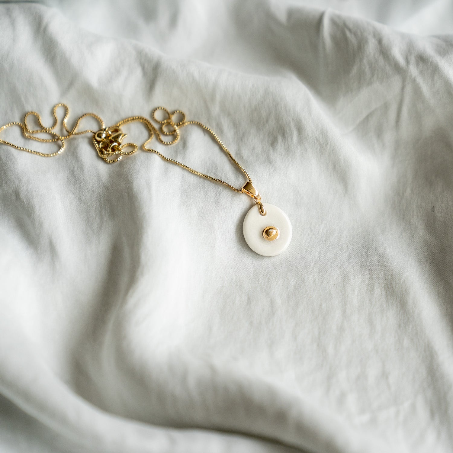 Medalla de porcelana modelada y esmaltada a mano, hermosa y delicada con detalle en oro de 22k. Cadena veneciana bañada en oro de 45cm con extensor (llega a 50cm).