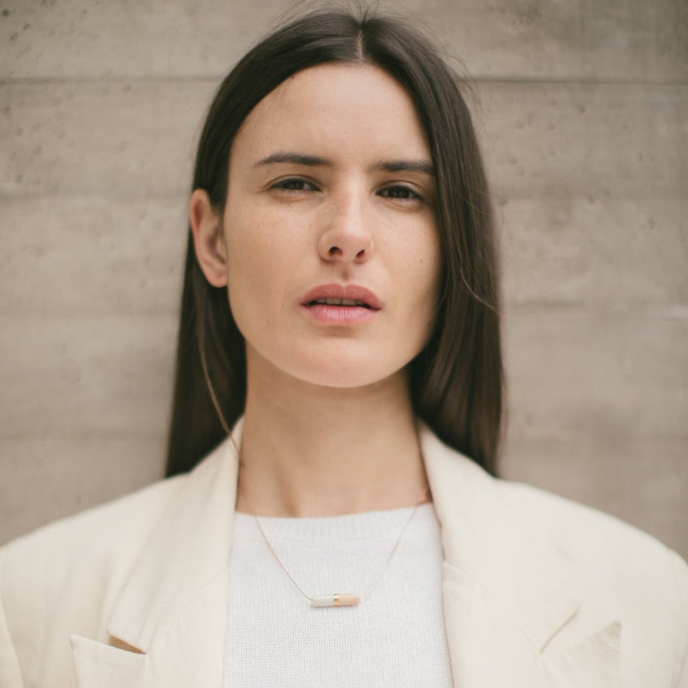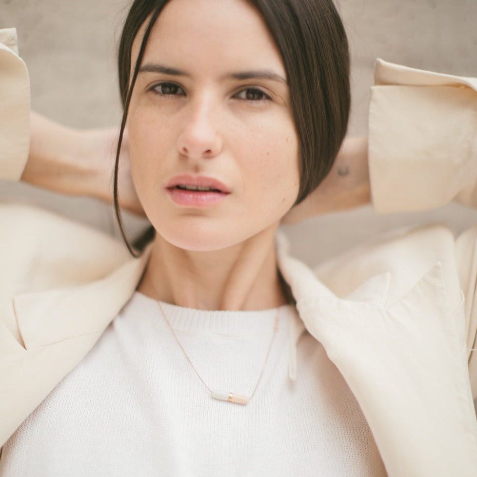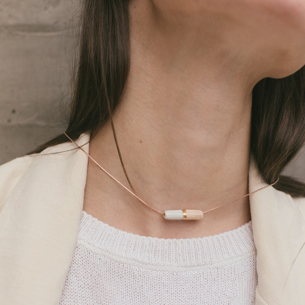 Pieza de cerámica moldeada y esmaltada a mano, quemada a 1060°C. Cadena de plata bañada en oro rosado.